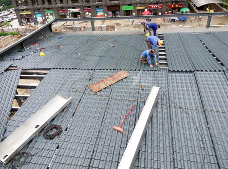 瓦片排列:從屋頂或墻面的底部開(kāi)始,按照預(yù)定的排列方案一層層地安裝合成樹(shù)脂瓦片。使用建筑膠或?qū)S媚z水將每塊瓦片牢固地粘貼在基層上。